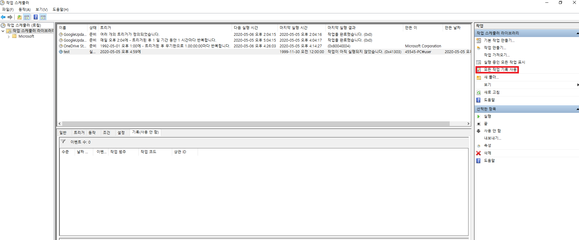 우측 '모든 작업기록 사용'을 누르면 작업기록이 표시됩니다.